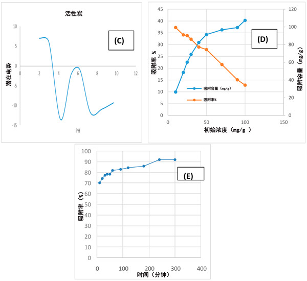 圖1:(A)吸附劑劑量的影響;(B)pH;(C)活性炭的電勢(shì);(D)乙酰胺的初始濃度;(E)通過活性炭除去乙酰胺的接觸時(shí)間。
