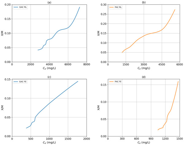 圖1顯示了顆粒活性炭與原浸出液,粉狀活性炭與原浸出液,粉狀活性炭與廢液以及粉狀活性炭與廢液的實驗等溫線。兩個樣品的曲線和兩個活性炭對應于S形的等溫線(II型)的行為,因為曲線是凹向上,所以多層吸附進行活性炭的表面上。利用該信息,就滲濾液而言,不管活性炭顆粒的性質(zhì)和大小如何,都可以假定吸附劑中殘留的化學需氧量是通過物理吸附發(fā)生的。