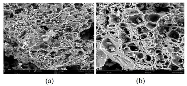 圖1:(a)未活化炭和(b)活性炭的SEM顯微照片。