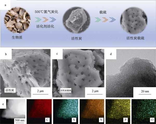首先,除去生物質(zhì)的污垢和表面雜質(zhì),用清水徹底清洗活性炭原材料,然后用蒸餾水反復(fù)清洗,然后將它們粉碎成碎片,然后在烤箱中100°C下干燥。為了進行預(yù)碳化,將干燥的生物質(zhì)在氮氣氛下的真空管式爐中在500°C的溫度下熱解2小時,以去除少量有機分子。隨后,為了通過化學(xué)活化提高比表面積,將預(yù)碳酸化的生物質(zhì)以1:4的重量比浸入作為化學(xué)活化劑的水溶液中,然后充分攪拌6小時以確保完全滲透。之后,將混合物在N 2下于900°C退火1小時。最后,用鹽酸反復(fù)洗滌退火后的樣品,然后用過量的蒸餾水沖洗以獲得中性pH。最終樣品通過在80°C的空氣中干燥獲得,并標(biāo)記為多孔活性炭。相比之下,使用相同步驟制備的未添加活化劑的產(chǎn)品被標(biāo)記為無孔活性炭。接著使用這兩種活性炭升級成加硫復(fù)合材料,將升華后的硫(純度>99.95%)和相應(yīng)的活性炭粉末(重量比為60:40)充分混合并在研缽中研磨。然后,將獲得的混合物用特氟隆容器密封在高壓釜中。在155°C下熱處理12小時后,獲得了多孔摻硫活性炭和無孔摻硫活性炭復(fù)合材料。
