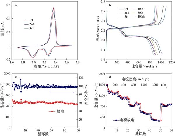 為了評估活性炭作為陰極的電化學(xué)性能,將鋰箔作為陽極組裝到鋰硫電池的紐扣電池中。用于第一,第二和第三個循環(huán)的循環(huán)伏安圖(CV)曲線上在0.05毫伏·秒的掃描速率的電位窗口進行(圖2A)。在第一循環(huán)期間,觀察到兩個陰極峰在2.26和1.97 V,CV曲線中最初的幾個循環(huán)幾乎重疊,這表明循環(huán)穩(wěn)定性極佳,容量保持率相對較高。活性炭的恒電流充電/放電曲線和循環(huán)穩(wěn)定性的測試中,如在圖中所描述2B、C;钚蕴侩姌O的首次放電容量為1045 mAh·g -1,約為硫理論容量的62.5%。此外,活性炭電極在第100次循環(huán)時也顯示出869.8mAh·g -1的放電容量。如圖2d所示測量活性炭的倍率性能,在200–3200 mA·g -1下表現(xiàn)出1260、1050、806、513、290 mAh·g -1的可逆放電容量。此外,當(dāng)電流密度達到800 mA·g時,活性炭陰極的放電容量為802 mAh·g -1。多孔活性炭材料表現(xiàn)出中等的鋰硫電池電化學(xué)性能,顯示出高性能鋰硫電池的潛力。