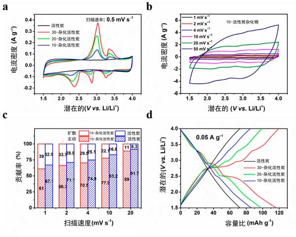 圖2:活性炭和活性炭雜化物在1.5至4V的半電池測(cè)試中的電化學(xué)性能。(a)所有樣品在0.5mV s-1的掃描速率下的循環(huán)伏安(CV)曲線,(b)活性炭雜化物1至50mV s-1之間的不同掃描速率下的CV曲線,(c)活性炭雜化物的擴(kuò)散控制法拉第過(guò)程和電容過(guò)程的貢獻(xiàn)率,(d)在0.05A g-1的電流密度下所有樣品的恒電流充/放電(GCD)曲線。