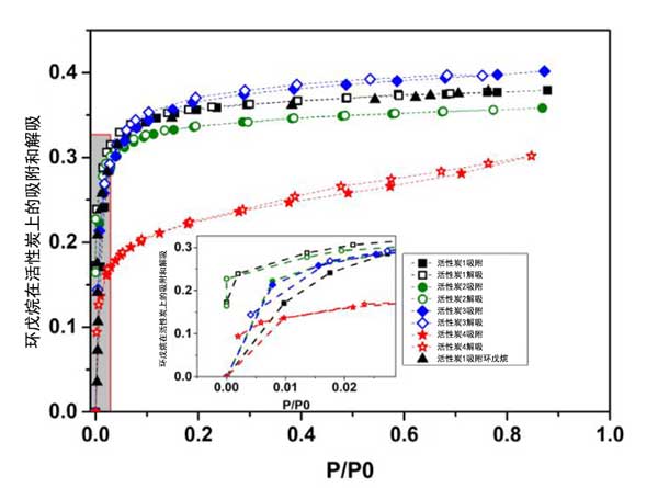 圖2:通過重量分析法測(cè)得的不同活性炭上環(huán)戊烷的吸附/解吸等溫線。
