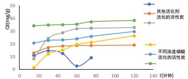 活性炭的吸附時間影響可從圖1看出,活性炭吸附分三步進行:第一是在最初的30分鐘內(nèi),污染物的吸附量很快就被確定了,這可以用在吸附劑的外表面存在大量空置的結合位點,這使得吸附劑易于吸附到該表面。第二在31分鐘后,吸附速率降低,過程緩慢。活性炭的其他位置達到飽和后,污染物顆粒將遷移到吸附劑內(nèi)部。由于易于接近,因此吸附過程緩慢:顆粒內(nèi)擴散。第三從80分鐘開始,我們觀察到一次接觸,活性炭已達到其最大容量。我們可以說這些吸附劑的平衡時間是80分鐘。然而,磷酸活化的活性炭吸附量的演化曲線顯示,在最初的30分鐘內(nèi),污染物的吸附量顯著增加,此后,污染物的吸附量急劇下降,這將是一種產(chǎn)物解吸。這一現(xiàn)象在其他吸附劑中是不可見的,這可能意味著可用孔隙的數(shù)量和結合力隨著所用活化劑濃度的增加而增加,這一點還通過碘值和亞甲基藍的值進行了驗證。
