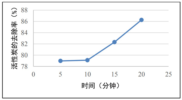 吸附時間測試:將豆腐廢液行業(yè)樣品溶液制備到四個燒杯中。在每杯中加入多達0.5克的椰殼活性炭。攪拌下靜置5分鐘,10分鐘,15分鐘,20分鐘。之后,用移液管吸取10mL溶液,然后將其放入試管中。加入0.4mL苯酚溶液,0.4mL硝普鈉,1mL氧化溶液。放置1小時以產(chǎn)生顏色。形成顏色后,使用濾紙將活性炭與樣品溶液分離。倒入比色杯,使用分光光度計對其進行分析,讀取并記錄其在640nm波長處的吸收。時間變化的吸附用K2CO3活性炭和HCl活性炭進行兩次。