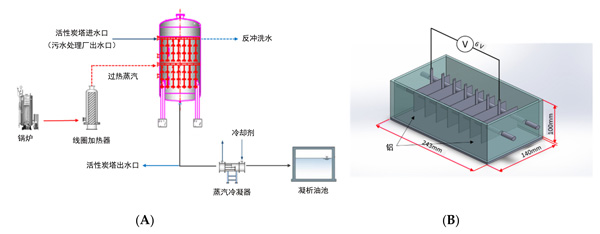 建造了一個(gè)用于微塑料去除實(shí)驗(yàn)的中試規(guī)模的設(shè)施,該設(shè)施由帶有熱再生系統(tǒng)的活性炭塔組成。該設(shè)備在接觸塔中運(yùn)行時(shí)的總質(zhì)量約為800千克活性炭。這個(gè)設(shè)施是由活性炭單元和過(guò)熱蒸汽單元組成的可熱再生裝置。該活性炭塔系統(tǒng)是在污水處理廠上建立的,收集污水樣本以進(jìn)行微塑料分析。如圖所示圖1A,蒸汽鍋爐中產(chǎn)生高于100℃的飽和蒸汽,并通過(guò)管線加熱器轉(zhuǎn)換為500-700°C的過(guò)熱蒸汽。蒸汽過(guò)熱進(jìn)行熱解過(guò)程,是由轉(zhuǎn)換后的過(guò)熱蒸汽通過(guò)塔內(nèi)的輻照管?chē)娮煸谟行О霃絻?nèi)噴灑到活性炭上,并提高了活性炭的溫度。通過(guò)噴灑500-700°C的過(guò)熱蒸汽來(lái)蒸發(fā)活性炭孔中的水分,并且通過(guò)無(wú)氧低溫將吸附的一氧化碳或二氧化碳和低分子量化合物與有機(jī)物和微塑料分解為水。此時(shí),將未分解的未溶解的低分子量有機(jī)化合物與冷凝水混合,并返回到污水處理廠的進(jìn)水口。從活性炭再生裝置下部排出的蒸汽由熱交換器冷卻,然后引入冷凝水儲(chǔ)罐,并返回到污水處理廠進(jìn)水或進(jìn)行后處理。