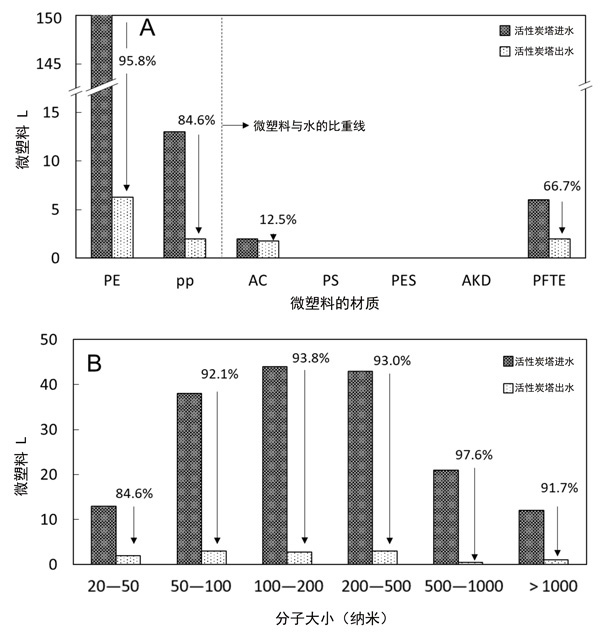 在污水處理廠的進(jìn)水和出水中觀察到未處理的污水樣品中觀察到七個(gè)不同的微塑料顆粒,包括聚乙烯(PE),聚丙烯(PP),丙烯酸酯(AC),聚苯乙烯(PS),聚酯(PES),醇酸樹(shù)脂(AKD)和聚四氟乙烯(PTFE)。PE是最豐富的MP材料類別,占MP顆?倲(shù)的72%,其次是PP(13%),AC(6%)和其他分?jǐn)?shù)相對(duì)較小的聚合物(1-4%)。假定樣品中微塑料材料類別的數(shù)量順序與原料的比重有關(guān)。具有較低比重的微塑料顆?梢酝ㄟ^(guò)從污水源沉降到污水處理廠的過(guò)程中,以較低的重力進(jìn)行更有效的輸送。在中試規(guī)模活性炭裝置的進(jìn)水和出水中觀察到的MP顆粒的數(shù)量濃度和尺寸分布分別顯示在圖2AB中。通過(guò)活性炭處理,可以顯著提高微塑料的去除率(92.9%)。特別是,發(fā)現(xiàn)活性炭處理在去除比水輕的微塑料(例如PE和PP)以及所有尺寸范圍的微塑料(包括20–50µm尺寸)方面都是有利的,而初級(jí)和生物處理很少去除這些微塑料。關(guān)于微塑料去除效率,配備活性炭過(guò)濾系統(tǒng)的飲用水處理廠獲得了類似的結(jié)果(大約89%的去除率)。