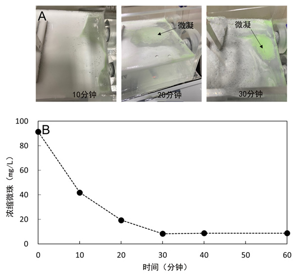圖3:電凝實(shí)驗(yàn)的結(jié)果:(A)微珠聚集的過(guò)程,(B)隨著時(shí)間的流逝通過(guò)離心濃縮不可分離的微珠。每個(gè)數(shù)據(jù)點(diǎn)都是重復(fù)實(shí)驗(yàn)的平均值。