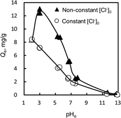 活性炭上的硝酸根離子吸附量與溶液的pH e之間的關(guān)系如圖1所示。硝酸根離子在堿性條件下幾乎不被吸附,這意味著氫氧根離子會(huì)抑制硝酸根離子的吸附。另一方面,隨著平衡pH的降低,硝酸根離子的吸附量增加。在堿性條件下,由于硝酸根離子與活性炭表面之間的靜電排斥,硝酸根離子很難被吸附在活性炭上。另一方面,硝酸根離子的吸附量在酸性條件下增加,這歸因于硝酸根離子與碳表面之間的靜電吸引力。然而,隨著平衡pH從3.0降低到2.0,觀察到硝酸根離子吸附的顯著降低。在此pH范圍內(nèi),氯離子的初始濃度從2 m增加到20 m M,這意味著共存的氯離子會(huì)抑制硝酸根離子的吸附。通過NaCl溶液將氯離子的初始濃度固定在20 m M時(shí),可以清楚地發(fā)現(xiàn)氯離子對(duì)硝酸根離子的吸附抑制作用,表明硝酸根離子在所有pH區(qū)域的吸附量均低于沒有任何pH調(diào)節(jié)的溶液。因此共存陰離子會(huì)導(dǎo)致競爭吸附影響硝酸根離子吸附的效果,并且這種作用可能是較強(qiáng)的在共存陰離子的濃度較高。